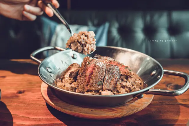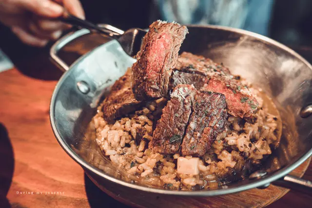 燉飯使用義大利米製作,吃起來粒粒分明、軟硬適中,若喜歡更加軟嫩的口感能請店家客製,燉飯以進口法國牛肝菌做成的醬汁來燉煮,每一口都有濃郁的蕈菇風味,翼板牛排的油脂分布均勻,並且帶有濃郁的牛肉香氣,肉質嫩滑的口感與燉飯相當絕配。