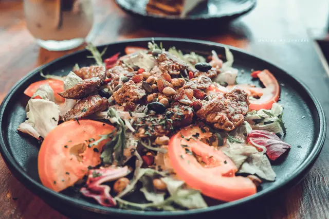 清爽的沙拉有切片番茄、堅果、牛肉,法式油醋經過店家改良成適合台灣人的口味,讓酸度平衡適中、也更加的開胃,牛肉保持了嫩滑和多汁的特點、帶有柔軟的口感,與清新爽口的沙拉相輔相成,份量也很滿足,適合夏季啊!