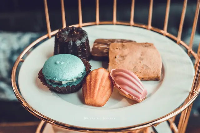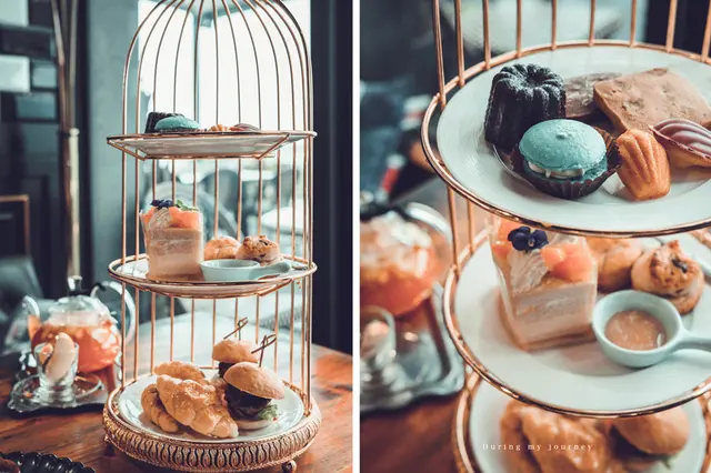 下午茶套餐充滿著貴氣與典雅,可以想像自己是皇家貴族在喝下午茶了(笑),並且附上兩杯自選200元的飲品,提供精選手作切片蛋糕、英式司康組、手作餅乾組、季節手作法式小點、牛肉/炸魚迷你漢堡組、楓糖小可頌組,共分成三層,一次網羅了女生最愛的甜點!