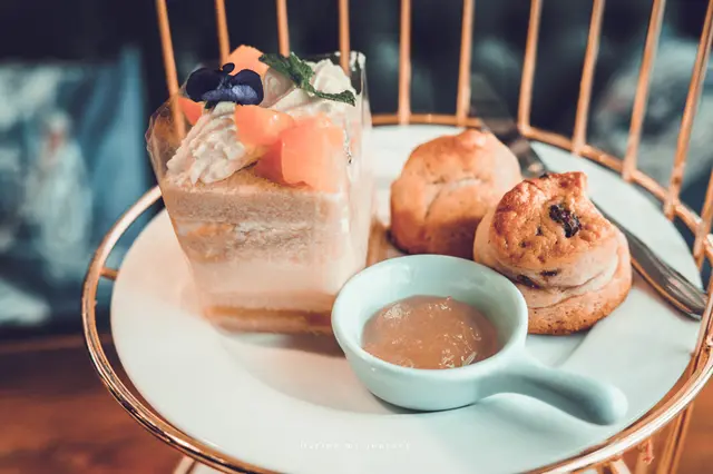 第二層是芒果仲夏戚風蛋糕和司康,我本身並不特別喜歡吃司康,因為普遍的司康都偏乾硬,但 Ton Up Cafe 的司康是外酥內軟,結合了酥脆鬆軟的口感,搭配上鳳梨蘋果果醬是很好吃的。
