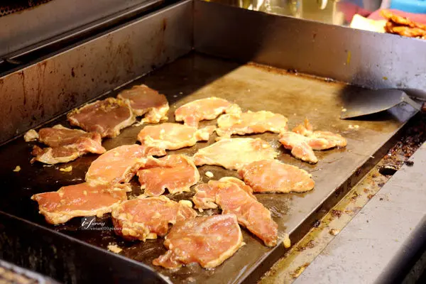 選用厚切的豬排,不假他人自己調製的醃漬醬料,一片片在煎台中等著變美味。