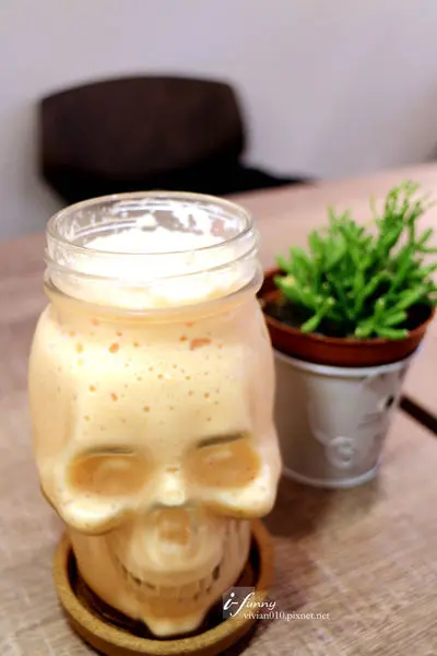 這個骷顱頭的杯子一上桌,就令人不禁噗哧一笑,而且與木瓜牛奶搭來有種詼諧感。
