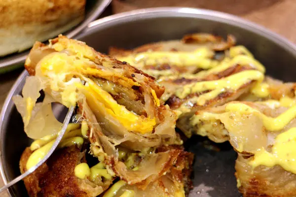 吃到很像是蔥抓餅般一層層的酥脆餅皮,加上了蜂蜜芥末醬,沒想到也很搭。