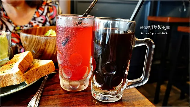 飲料我點了蔓越莓氣泡飲(左),我家阿母點的是黑咖啡(右)