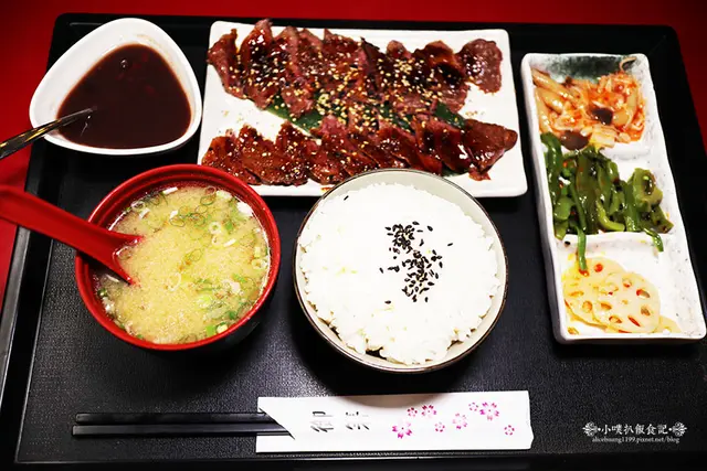附上:白飯、味噌湯、三樣小菜、主菜:炙燒牛小排、紅豆湯