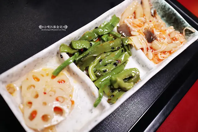 附上三樣小菜: 涼拌杏鮑菇及金針菇、醃漬貢菜、涼拌藕片