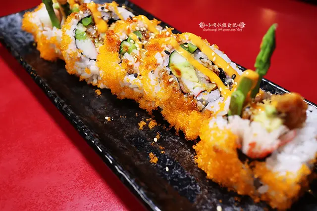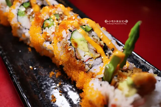 以米飯包覆炸蝦,捲附蘆筍,捲成壽司後,外表沾附滿滿的蝦卵及明太子醬