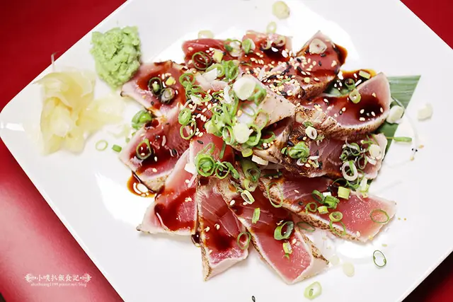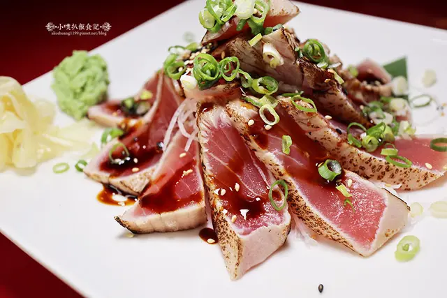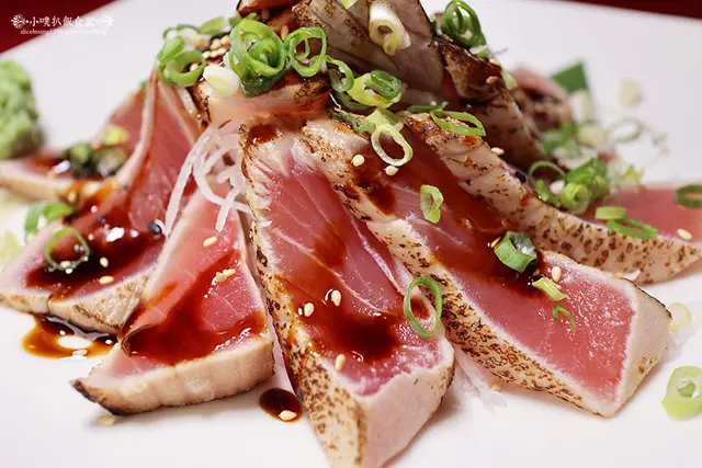 以炙燒烹調鮪魚生魚片,外層略微焦香,內層保有新鮮鮪魚的鮮度與美味口感