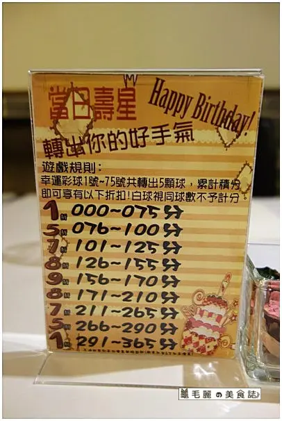 一旁的黑板上,寫著「當日壽星幸運轉輪」,手氣最好的,甚至可以以一折價享用到美食。