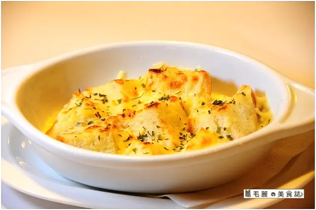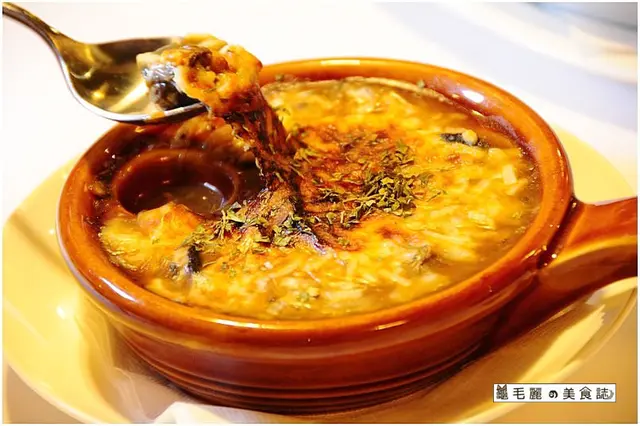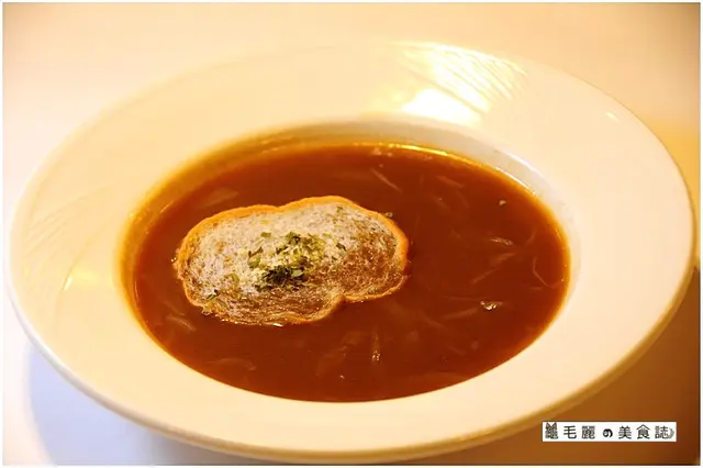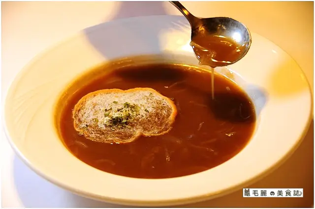 洋蔥湯:深琥珀色的洋蔥湯,是用牛肉去熬煮的湯底,喝起來帶有淡淡的洋蔥甜味。