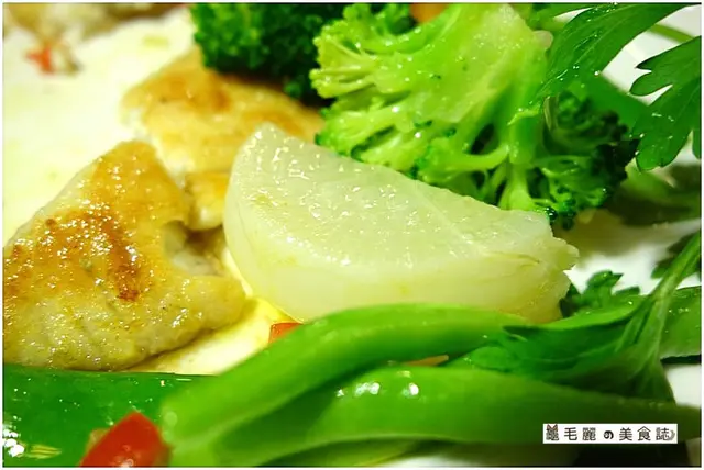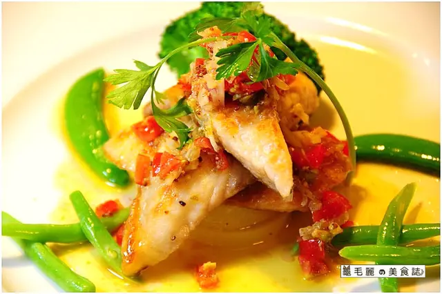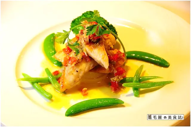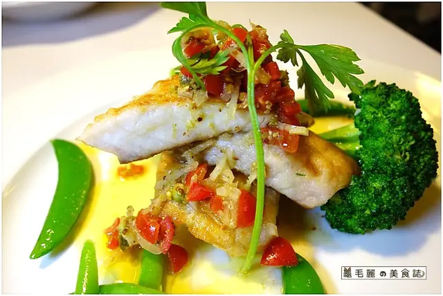 煎至金黃的鯛魚片,搭配蕃茄、洋蔥以及各種深淺不一的綠色蔬菜,甜豆、四季豆、青花椰、香菜…