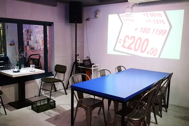 這一面有播放卡通投影,前面的桌椅感覺像會議桌,也可以在這開會或餐敘!!!