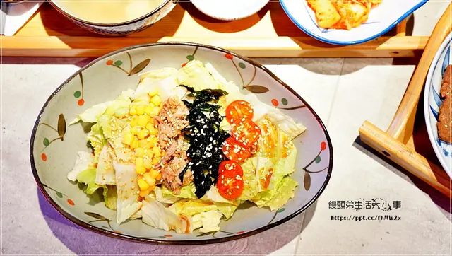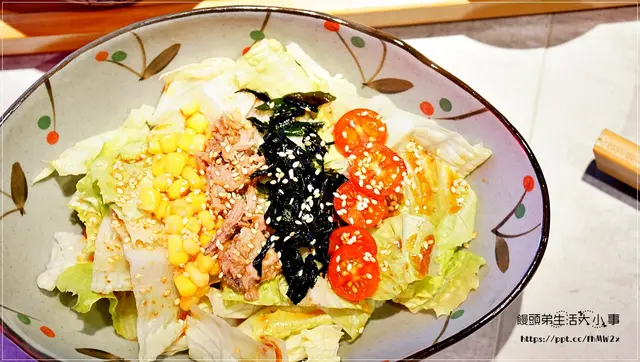和風沙拉有小番茄/海帶/鮪魚/玉米,把它們攪拌一下,風味更好
