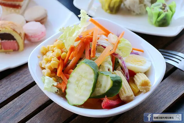 玉米筍 玉米 苜蓿芽 甜椒 水煮蛋都有 旁邊有千島醬可以搭配享用喔~