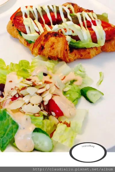 我點了德國香腸可頌套餐,包含一杯飲料和一份沙拉。德國香腸可頌份量頗大,光看外觀就讓人垂涎三尺。可頌麵包表皮烤得酥脆,生菜清脆、酸黃瓜給的大方,和德國香腸根本是絕配。生菜沙拉上頭撒了些杏仁片。杏仁片的清脆口感,替生菜增色不少,沙拉醬吃起來清爽,非常適合夏天的口感。