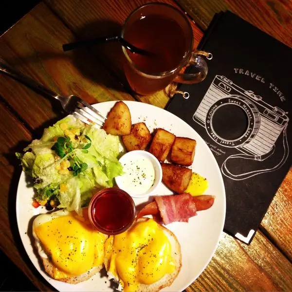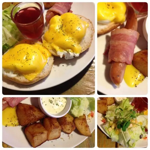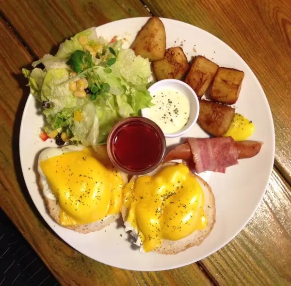 套餐包含了沙拉、德式煙燻香腸、培根、薯角、經典高鈣起司、義式班尼迪克蛋