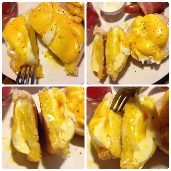 雖然水波蛋的蛋黃不會有涓涓的蛋液留下,但還是有微微的蛋液,吃起來不會流的整個手都是