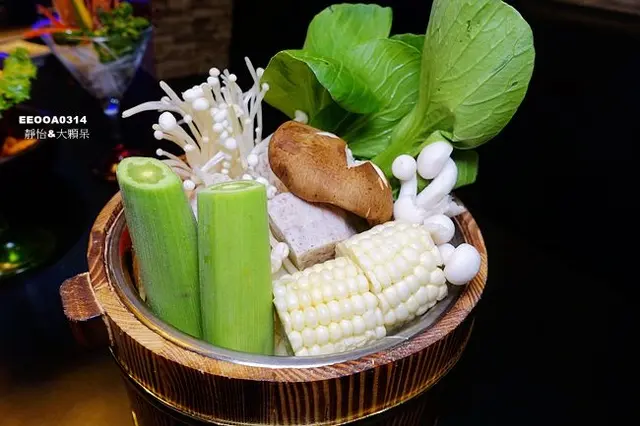 時蔬包含了帶殼玉米筍、水果玉米、綜合菇、芋頭、高麗菜及青菜等