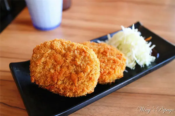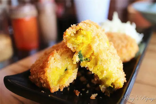 使用北海道栗南瓜為內饀,外層炸的酥脆,附上生菜絲及沾醬。