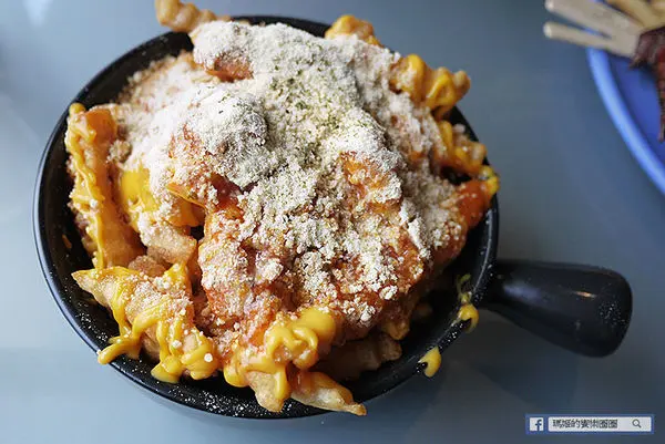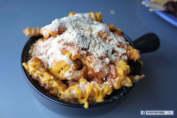 「肉醬起司波浪薯條」128元,這是店裡超人氣的必點美食,現炸起鍋的熱騰騰薯條,再淋上熱騰騰的肉醬、搭配現煮起司醬,最後在灑上帕瑪森起司粉,用小鐵鍋裝著堆著像小山,份量相當多,就算我們帶了非常愛吃薯條的小妞,也是被這份量大吃一驚!