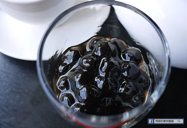 像黑珍珠發亮的波霸珍珠,另外裝在透明玻璃杯裡。