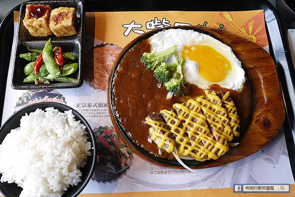 「起司鐵板牛排」218元,這也是在菜單中看到人氣推薦點的,同樣附有一碗白飯、小菜和甜湯。