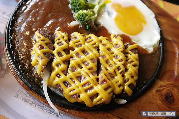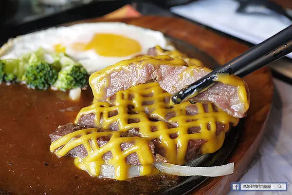 鐵板套餐送上來總是滋滋作響,大塊牛排上淋上起司醬,旁邊還有特調牛排醬。