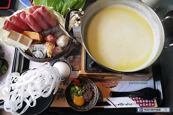 「無敵超濃起司牛奶鍋」248元,整份鍋物包含肉品和菜盤,還有一顆生雞蛋,副食有白飯或寬冬粉可選,我們選了寬冬粉。