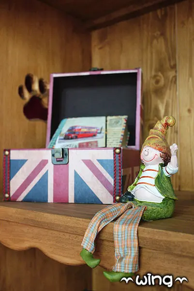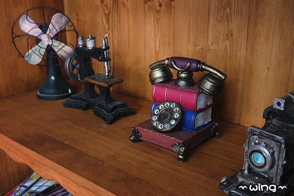 樓梯旁的櫃子擺放了不少店家收藏品,有古董電話、電風扇、娃娃公仔等,