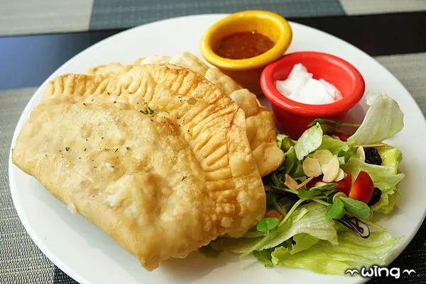 而附上的兩種沾醬分別是俄羅斯莎莎醬及酸奶醬。