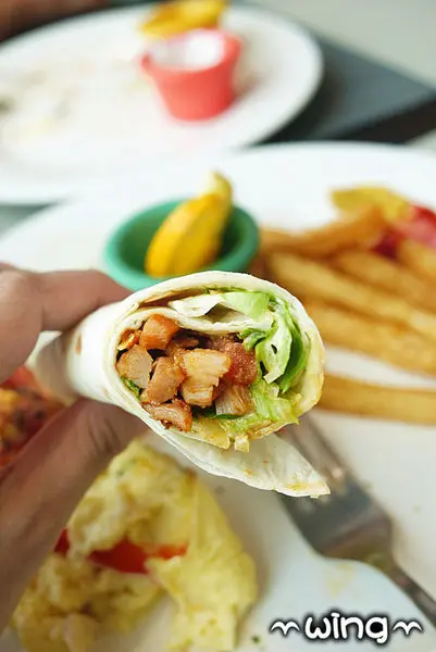內饀包覆不少塊辣雞肉片,搭配生菜、蕃茄丁及特調醬料等,