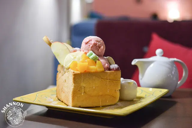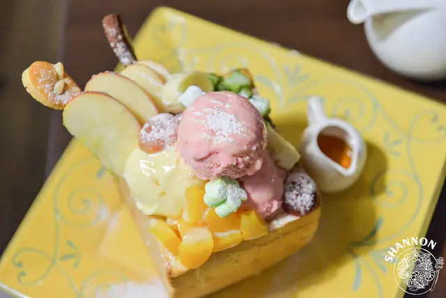 甜點的部份我們已經有些飽了,因此這樣大份的甜點我們根本吃不完,光用眼睛看下去這超豐盛的呢,其中我喜歡叉在上方的餅乾和新鮮水果,外面的吐司部分我覺得可以烤香一點會更加誘人!