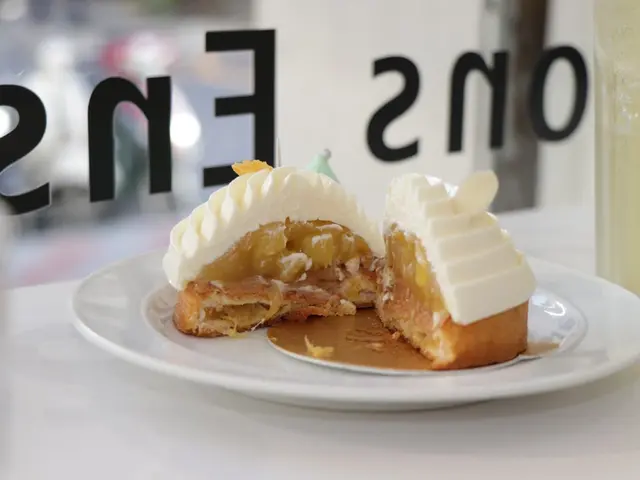 這顆甜點是個特別的組合,上層杏仁奶油因為有著特殊香氣而別耐吃,清爽不油膩,鳳梨醬熬煮的口味酸甜適中,有些鳳梨塊還留有一點口感。中間有一層焦糖,最下面乍看以為是塔皮,結果原來是泡芙,吃起來是軟軟又帶一點點Q勁的,但口味上有點鹹,單吃會覺得有點出戲,一定要搭配上面的奶油一起吃。