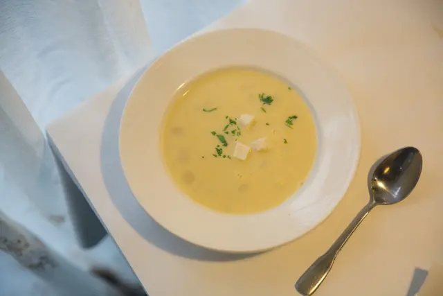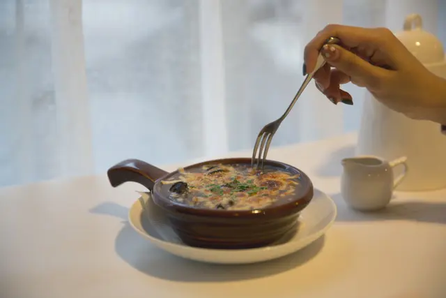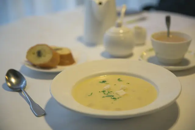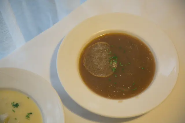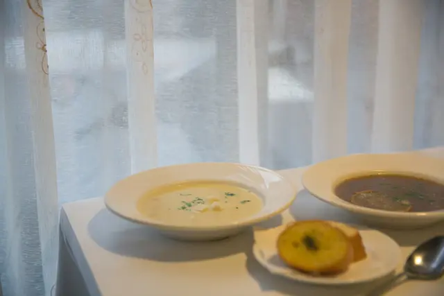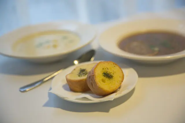 湯品是洋蔥湯和玉米巧達湯,搭配烤得酥酥的蒜片吐司,好吃