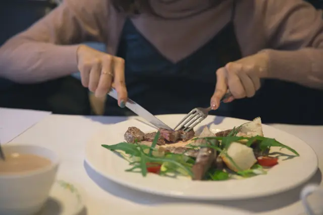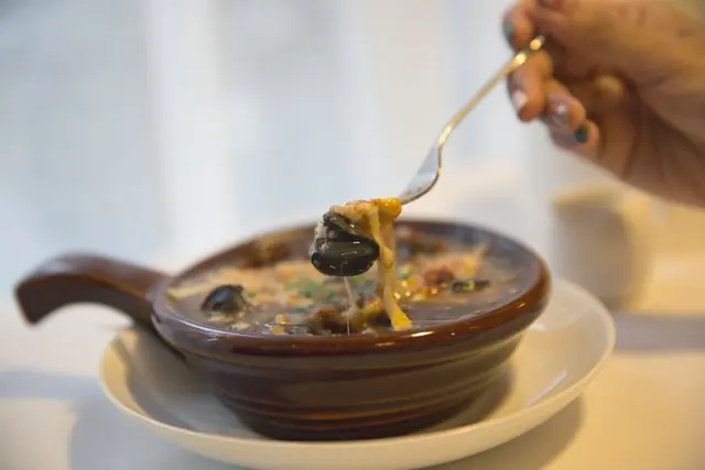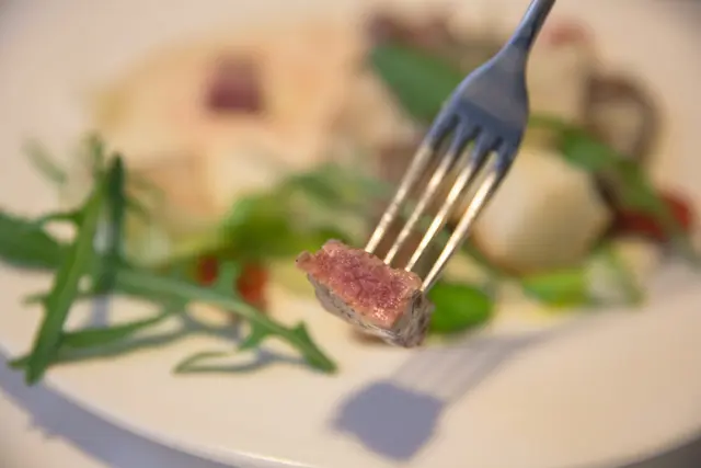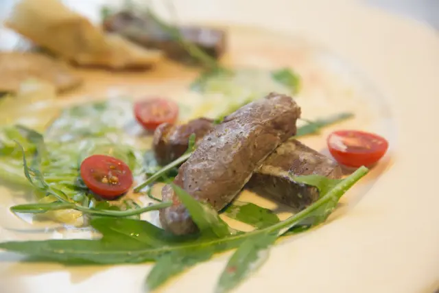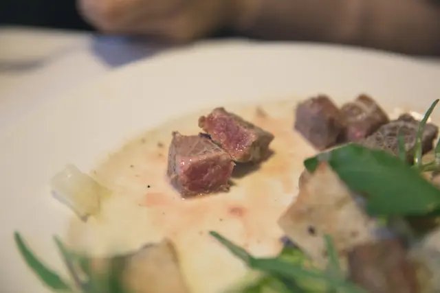 已經切成條狀的牛排,和藍紋起司緊密融合,濃厚的牛肉香和藍紋氣味相稱,找不到詞彙好好形容這滋味,若是吃膩總是一大塊牛排放上桌的你,可以來試試看揮別炸蒜片、牛排醬汁的新穎吃法
