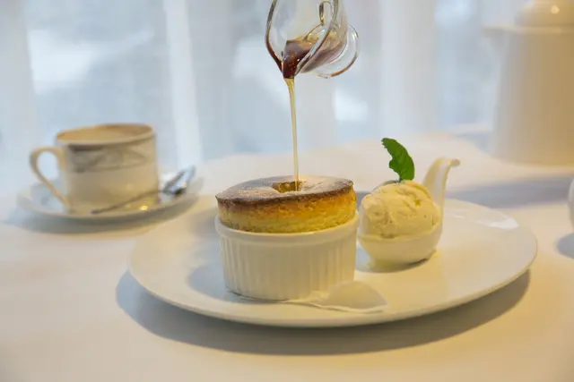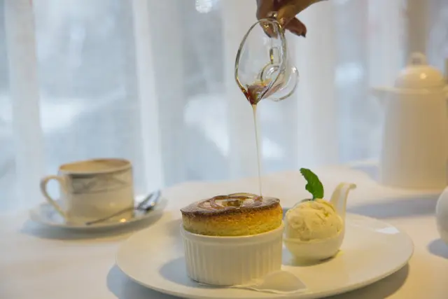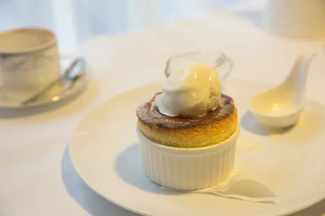 直接在舒芙蕾中心挖了洞,淋入楓糖醬,再把香草冰淇淋封住入口,用湯匙由上往下挖,每一口吃得到冰淇淋、楓糖和舒芙蕾