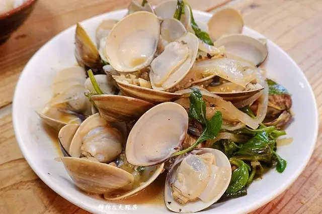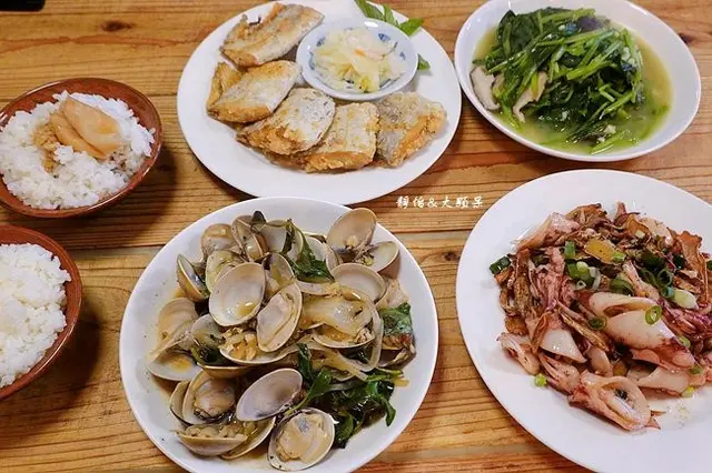 我們兩大兩小點了豬油拌飯、薑爆小卷、季節炒食蔬、恰恰白帶魚及酒蒸蛤蜊,來漁港就是要吃海鮮啊,真是爆新鮮的啦,每道料理風味也都很不錯,我們全部吃光光