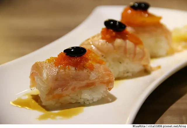 壽司米上放著一片炙燒過的生魚片,看起來就是很美味的感覺阿!!