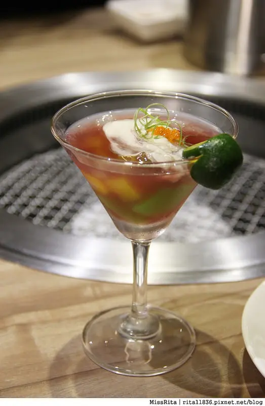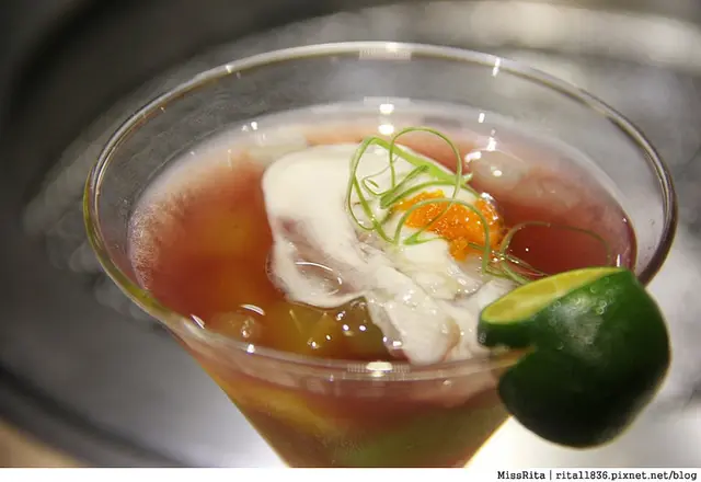 外型就像是雞尾狗一樣漂亮,裡頭有蔓越莓醋飲和鮭魚凍