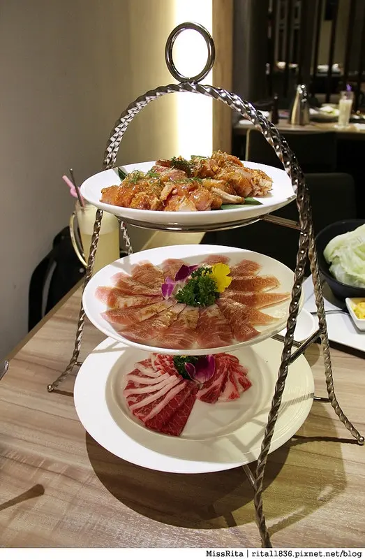 這不是一般上甜點用的鐵架嗎哈哈!一盤盤精緻擺盤的肉放在上頭就好像是藝術品一樣
