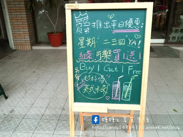 門口處的黑板上,還有近期推出的優惠活動,每週二~四點選可樂&紅茶可享買一送一唷
