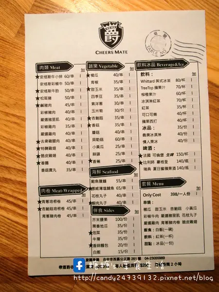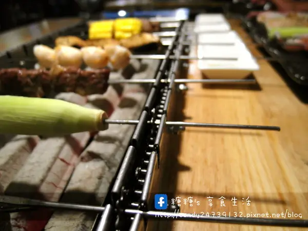 爵串燒的價位算中等價,肉品類居多,海鮮偏少了些,菜色還蠻多樣化,不過仔細一瞧裡面竟然沒有糖糖最愛的豆干、甜不辣及米血,有點小可惜,這三樣可是串燒必點的說 除了單點外,也推出了套餐,一人398元,可享有10樣烤物、白飯、紅茶及冰品各一份