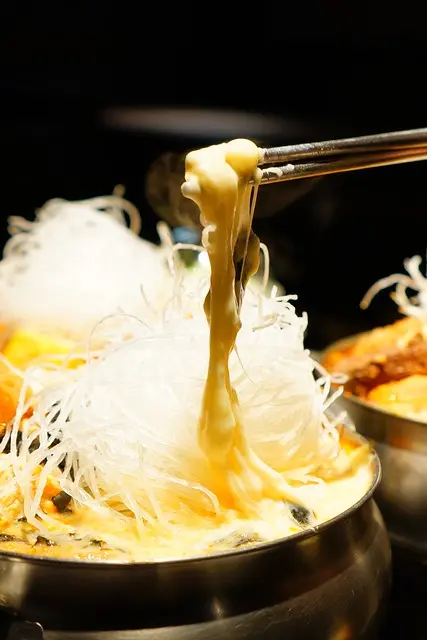 當然也少不了起司,融化的起司拌上奶香十足的牛奶鍋底,還有微微的辣度,越煮越香濃夠味,聽說最好吃的吃法就是點一鍋泡菜鍋再點一鍋起司奶鍋,兩鍋湯頭混搭驚喜加倍