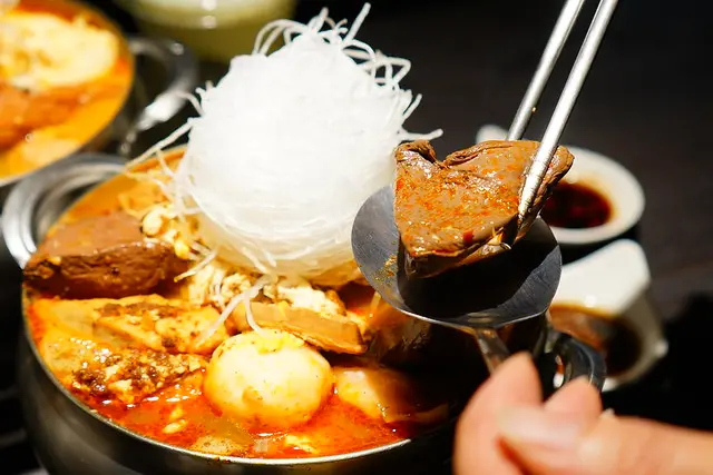 又辣又香的麻辣湯頭,非常入味的鴨血和豆腐,浸潤在麻辣湯裡的冬粉好好吃唷!!