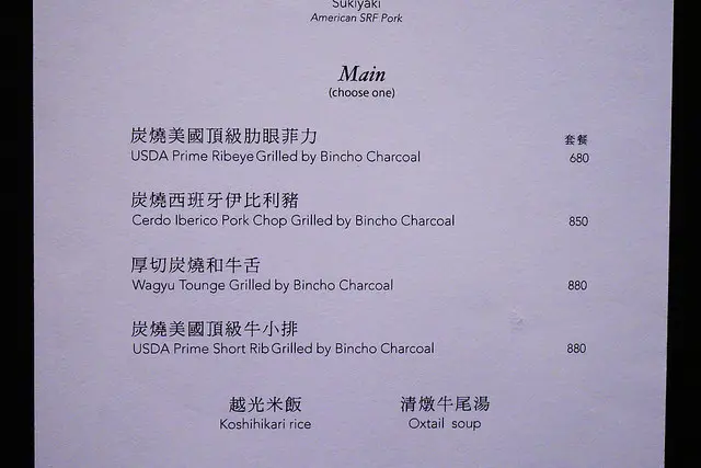 炭燒美國頂級肋眼菲力套餐680元,是我最推薦的一道,必點,憑良心說上次來吃壽喜燒時對於美國頂級肋眼菲力的肉質感覺口感還行,稍乾了些,但我發現比起用在火鍋肉片上,美國頂級肋眼菲力更適合用於炭火燒烤