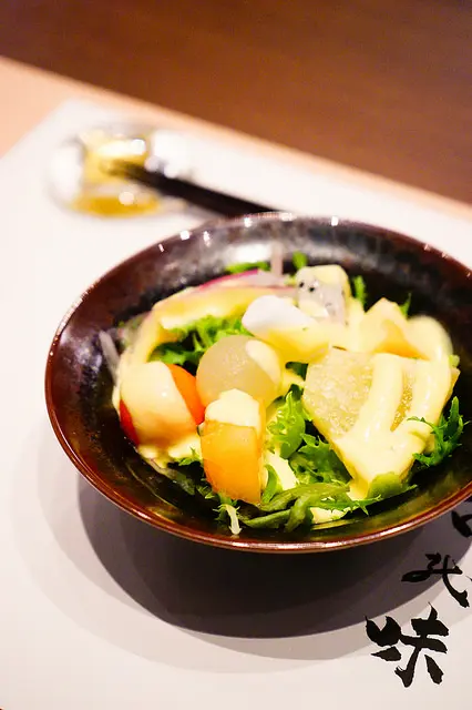 季節水果沙拉,每次來吃的內容可能都會有所不同,因為食材會因季節變化而改變,將各種水果都挖成球狀,像多彩的水晶珠,光看就消暑,搭配的是清爽微酸的芒果優格醬汁,還充滿童心的擺上棉花糖,其實棉花糖跟生菜水果還挺搭的