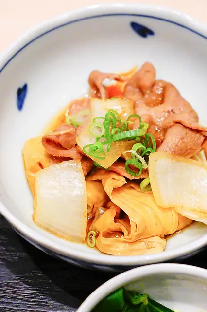 黑豚洋蔥鋤燒,就是壽喜燒香甜的口感,煮的軟爛的豆皮、洋蔥還有黑豬肉,光這道的醬汁就讓人再添一碗飯了