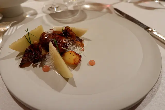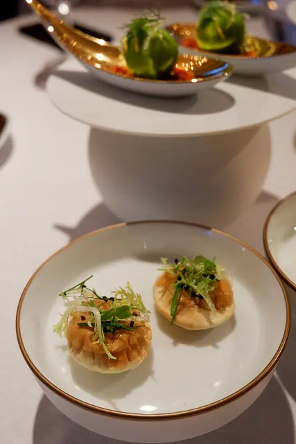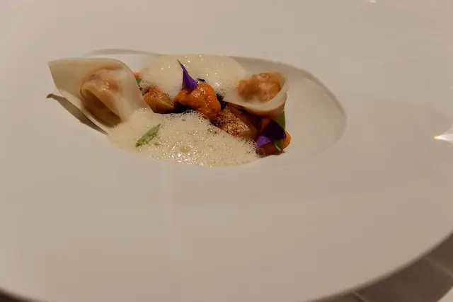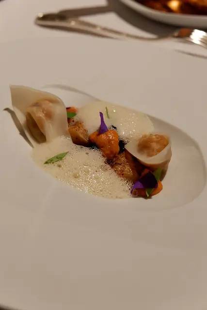 花枝餃搭配西班牙海鮮飯,配上海膽與菊芋泡泡,光是聽食材我就喜歡,手工花枝餃好彈牙,海鮮飯很想在請他們上一整盤上來,我果然很不夠優雅,想要把法式料理當義式料理吃