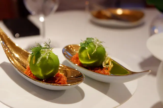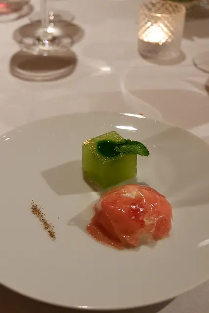 綠色的醬汁是香椿與墨西哥青辣椒做成的,粉紅色的是番茄打成的冰沙,朋友上個月才來吃過,說搭配的是海苔冰沙,也很好吃,跟生蠔更搭,這個月又有點小變化