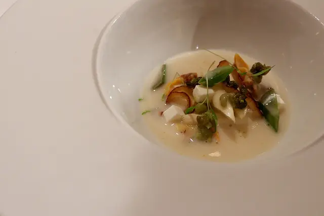 淋上花生和白蘆筍熬煮而成的熱湯,頓時香氣四溢,湯頭濃郁中又帶著輕甜,尾韻又帶著苦,是很成人的味道